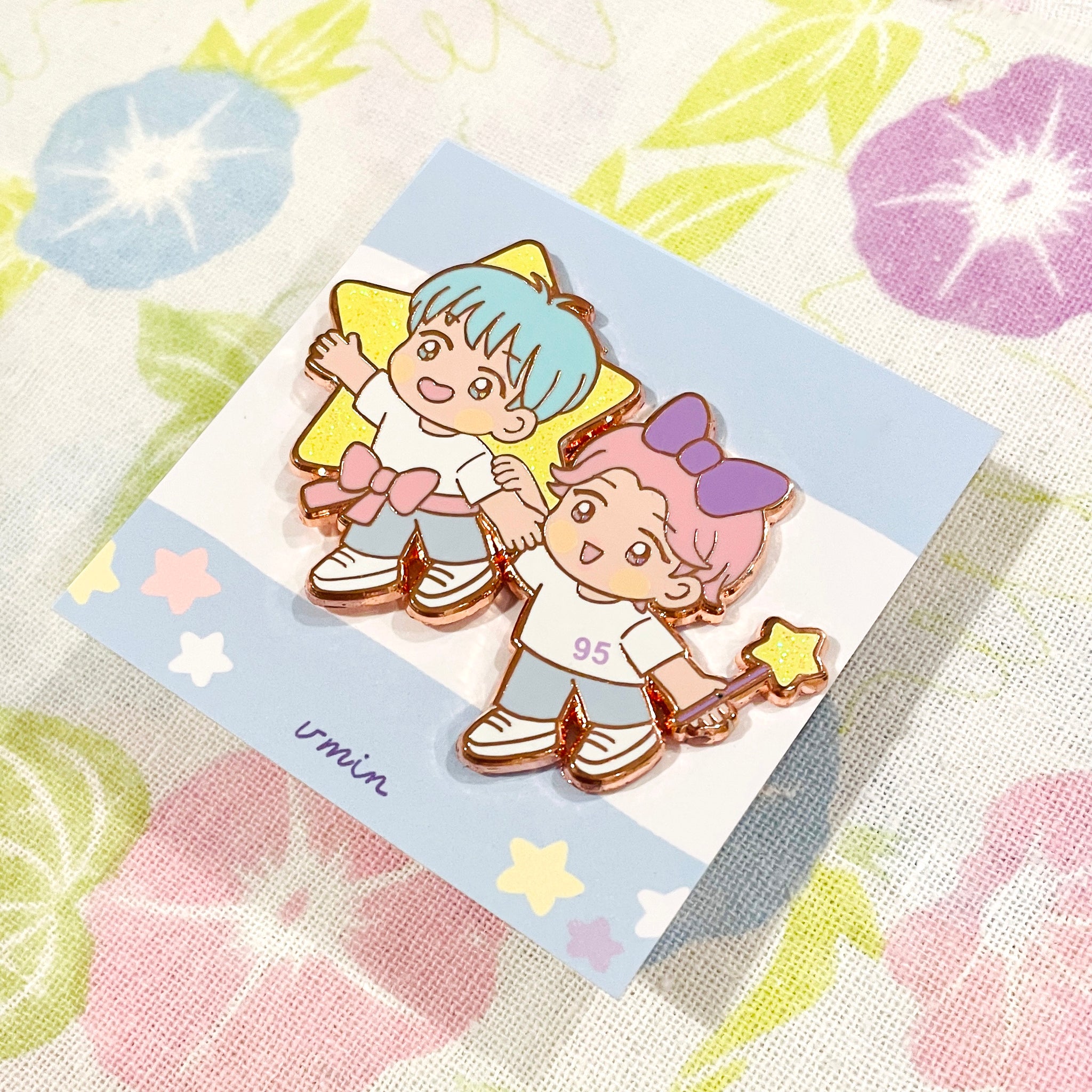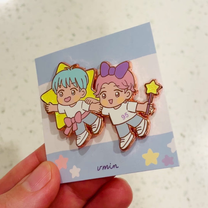 Taehyung & Jimin twin stars enamel pin, with rose gold plating. Approx. 1.5" tall