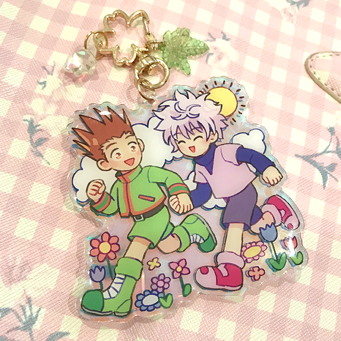 Charm printed on shiny rainbow acrylic, approx ~3" in height, attached to a cute star swivel clasp with matching accessories