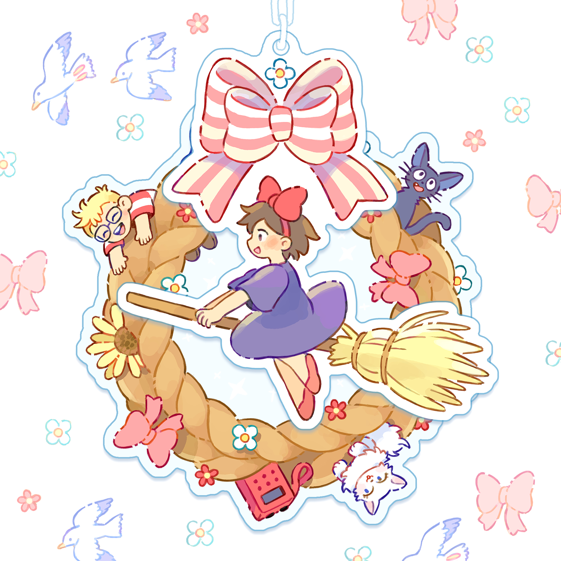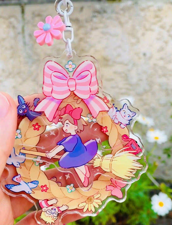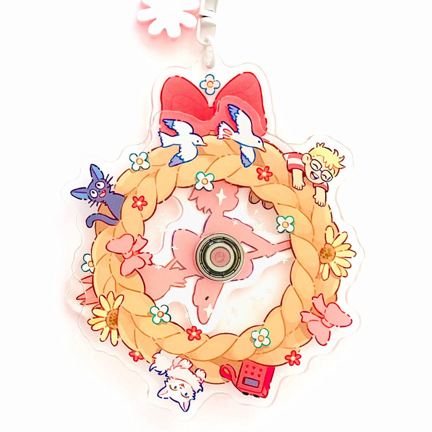 Double acrylic spinner charm, approx ~3.5" in height, attached to a swivel clasp with flower accessory
