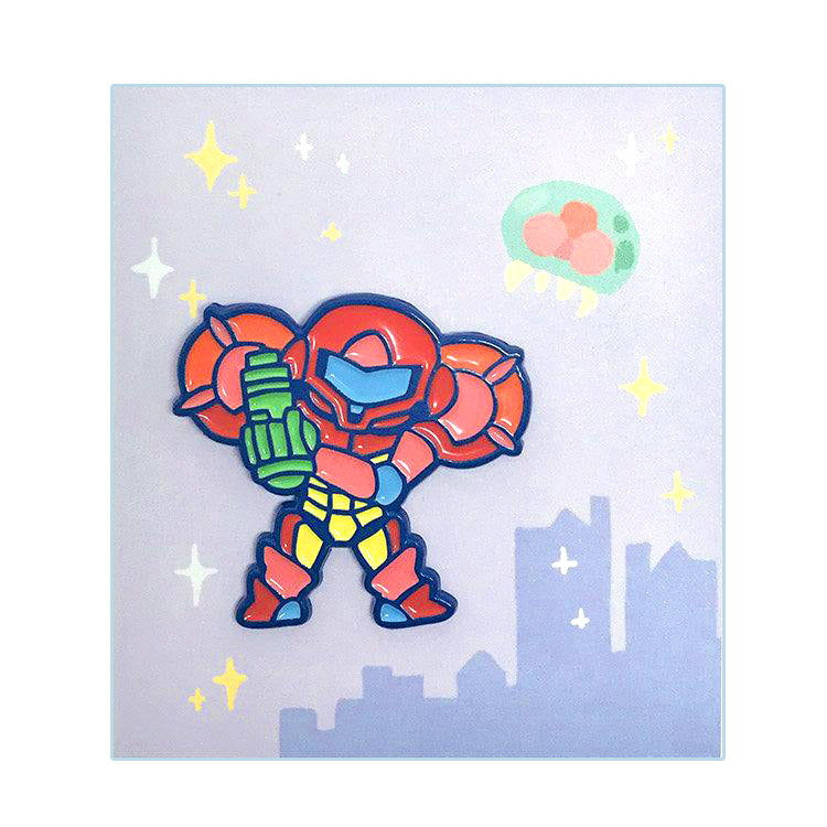 Samus enamel pin ~1.5" and includes two pinbacks